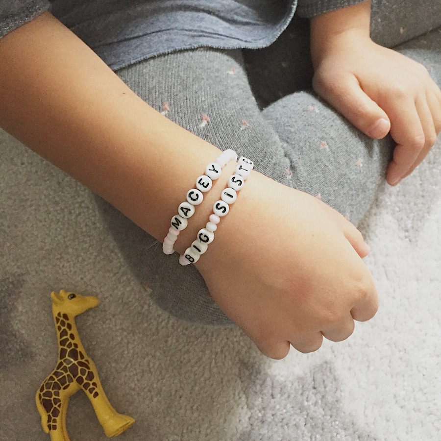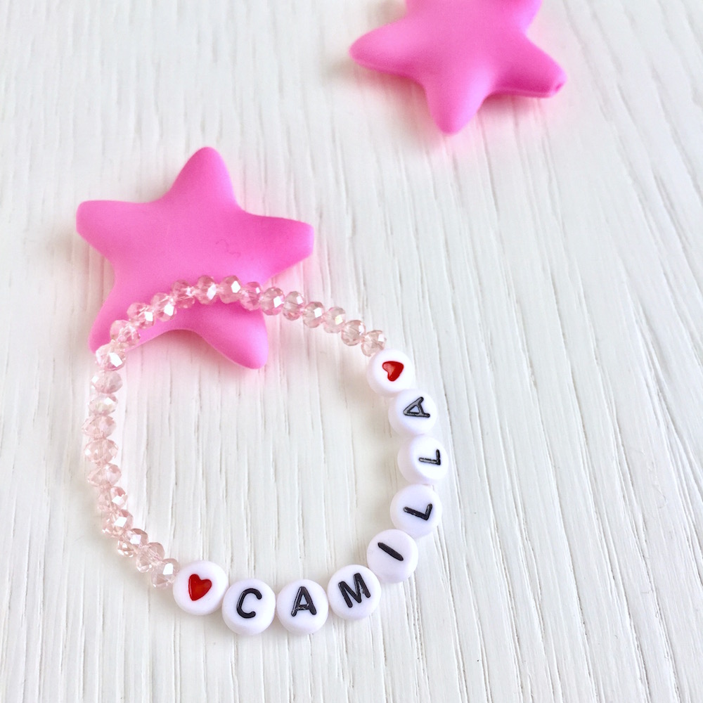 Un bracciale personalizzato realizzato con letterine di materiale acrilico contornate da perline in cristallo colorato.