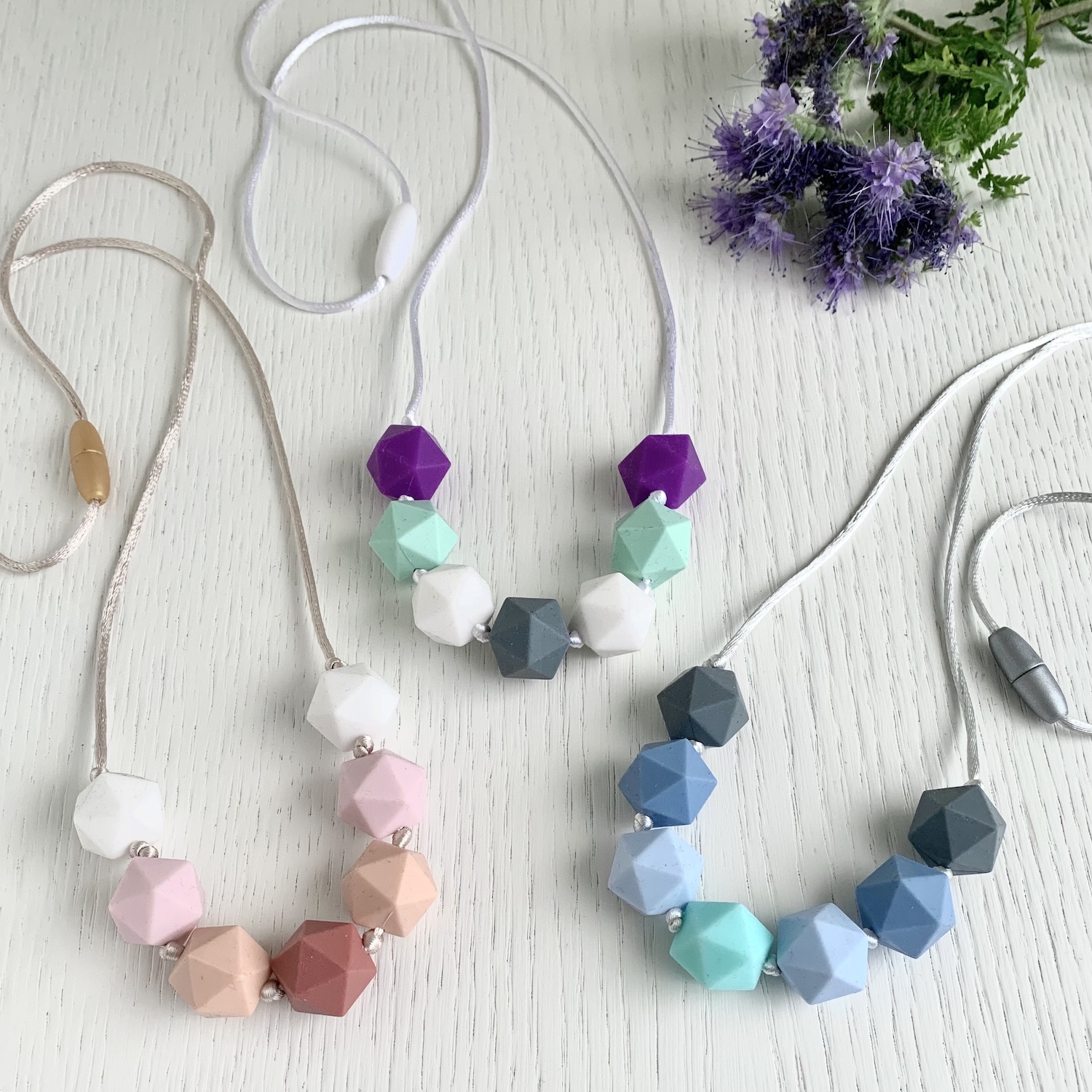 Con i loro meravigliosi colori e la forma geometrica, sono adatte ad essere indossate in qualsiasi occasione, se poi avete anche un bimbo in braccio, sappiate che si potrà divertire e tranquillizzare con la vostra collana senza aggrapparsi ai vostri capelli, ai vostri orecchini, alle vostre magliette.