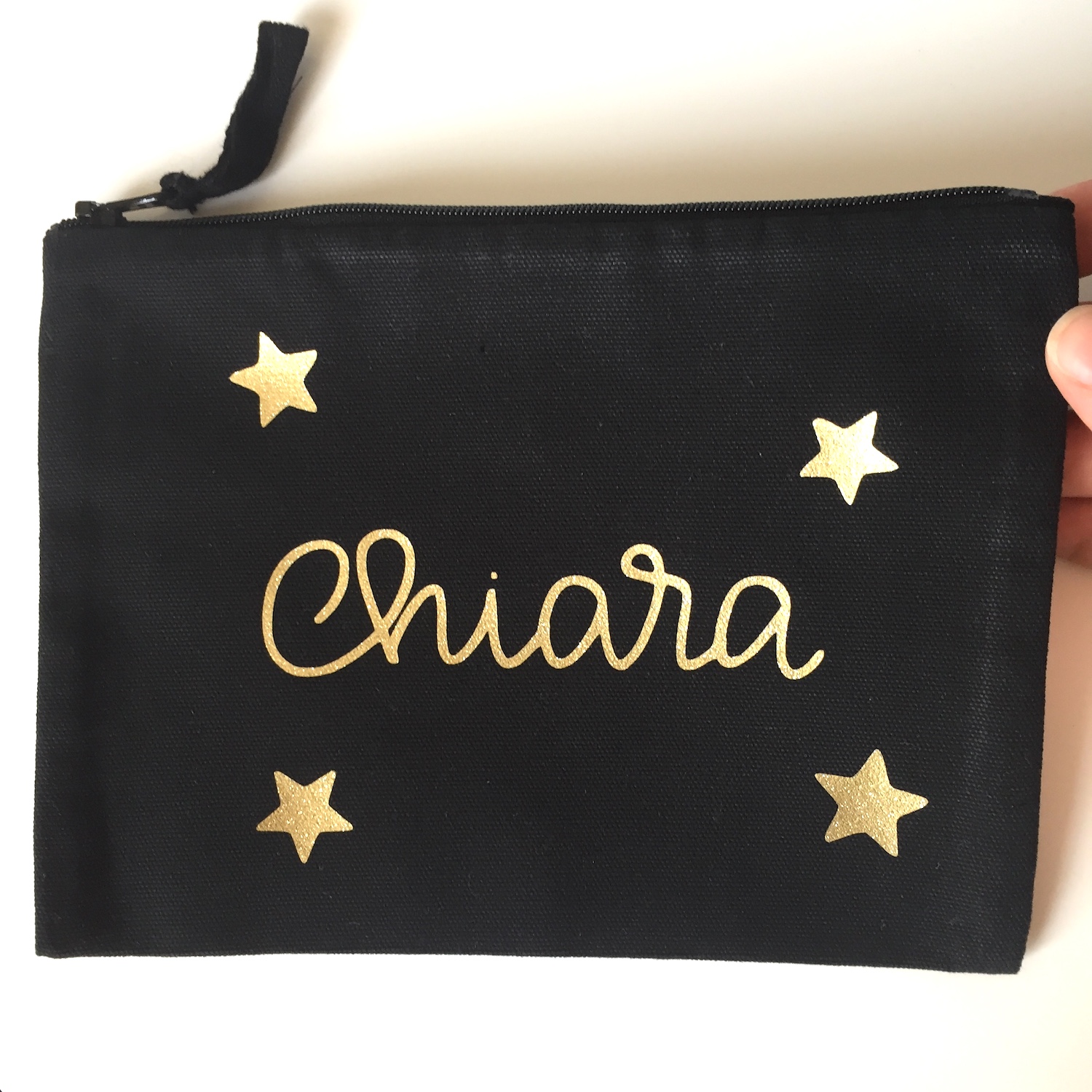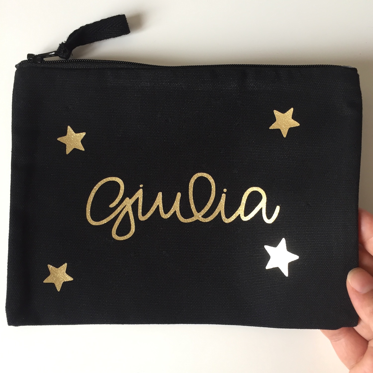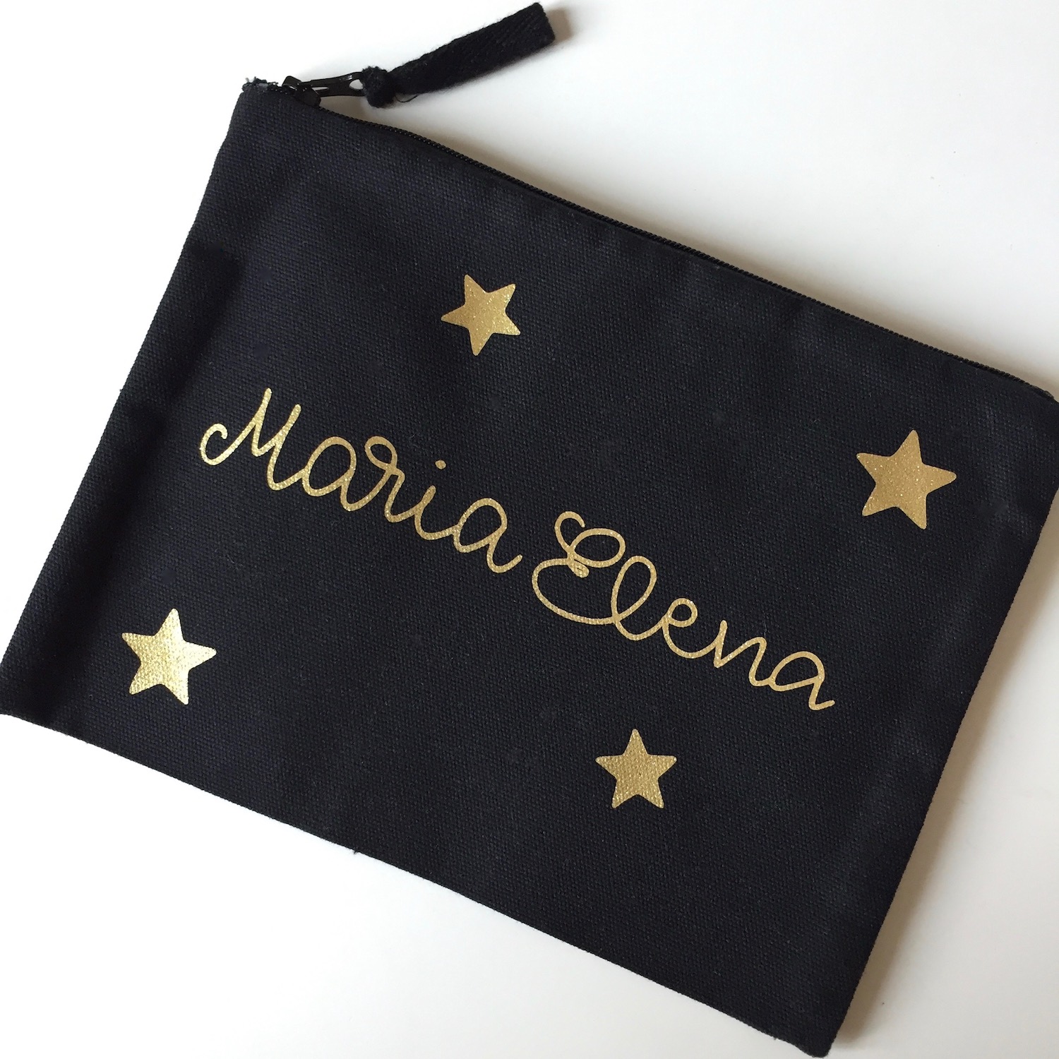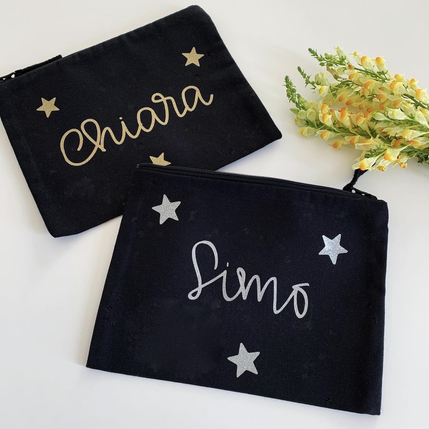 Astuccio nero con nome o scritta personalizzata color glitter. Misure: 21,5×16 cm. Cotone bio riciclato. Zip con tirante